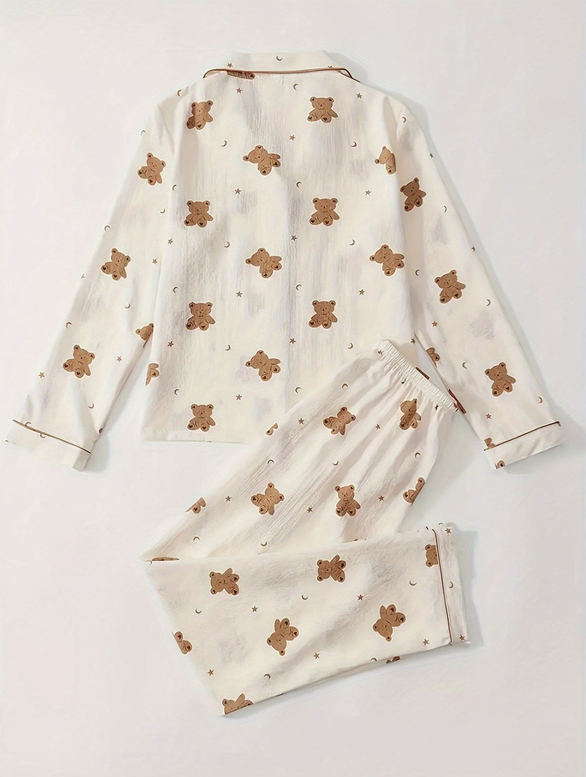 The set includes a full sleeve button down top with a classic collar and matching pajama bottoms. The cream base is beautifully detailed with cute teddy bear prints along with tiny stars and moon accents, giving it a warm and dreamy vibe.