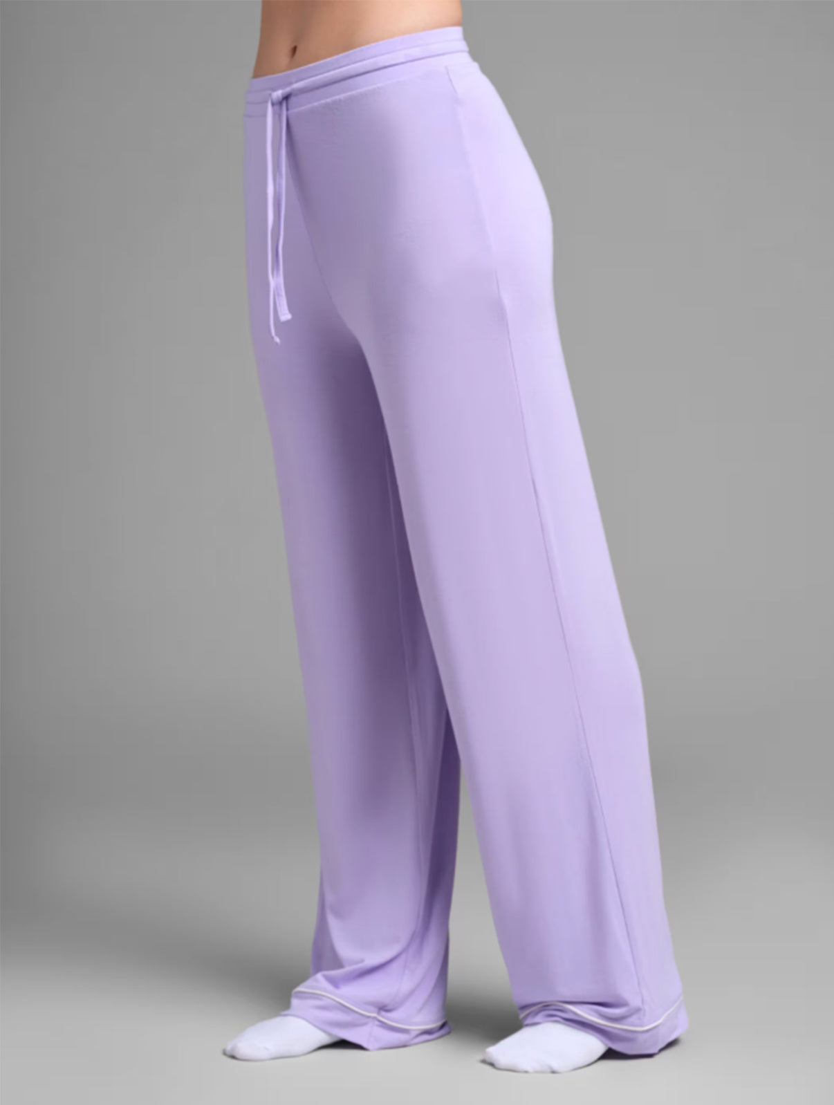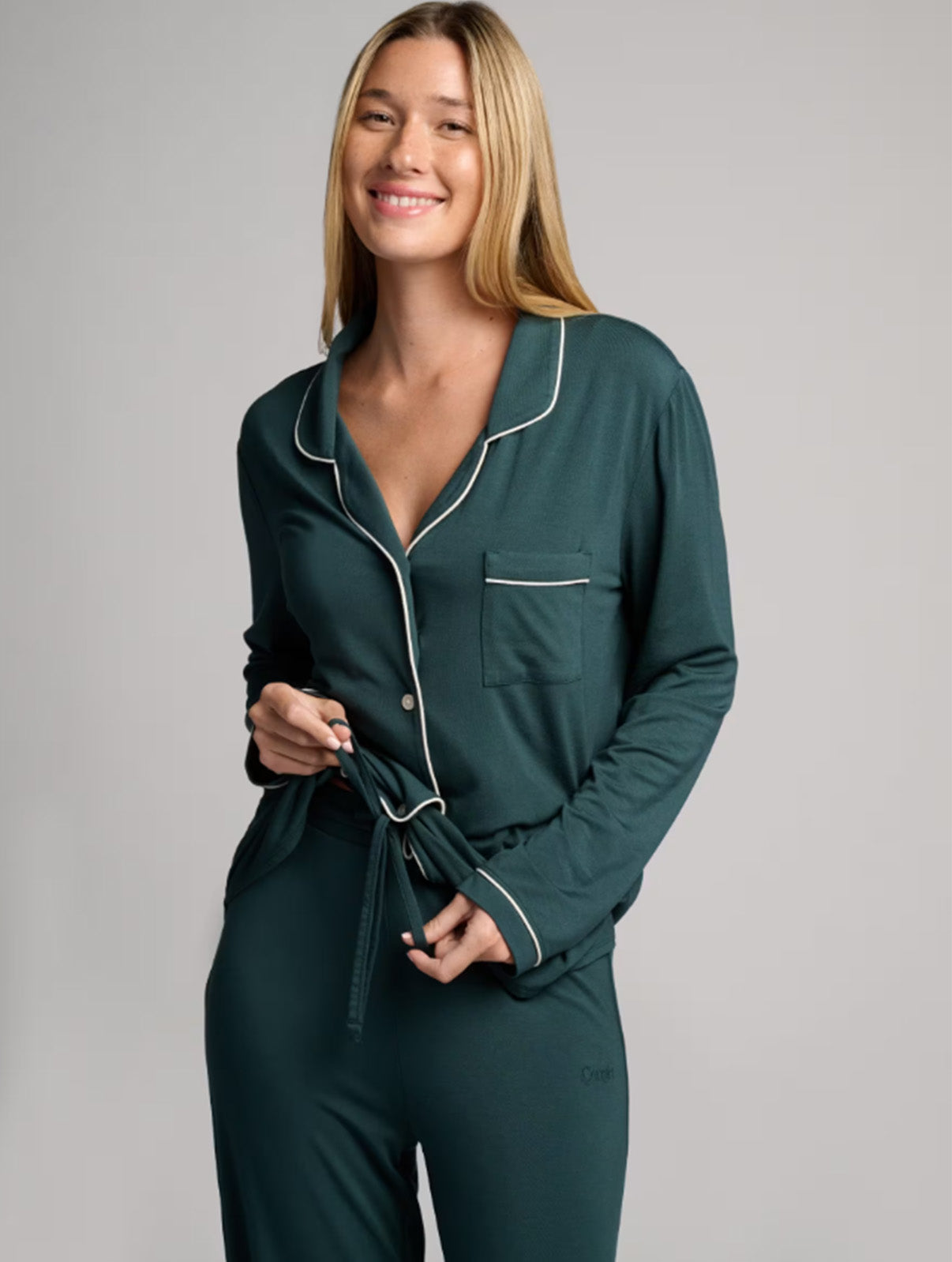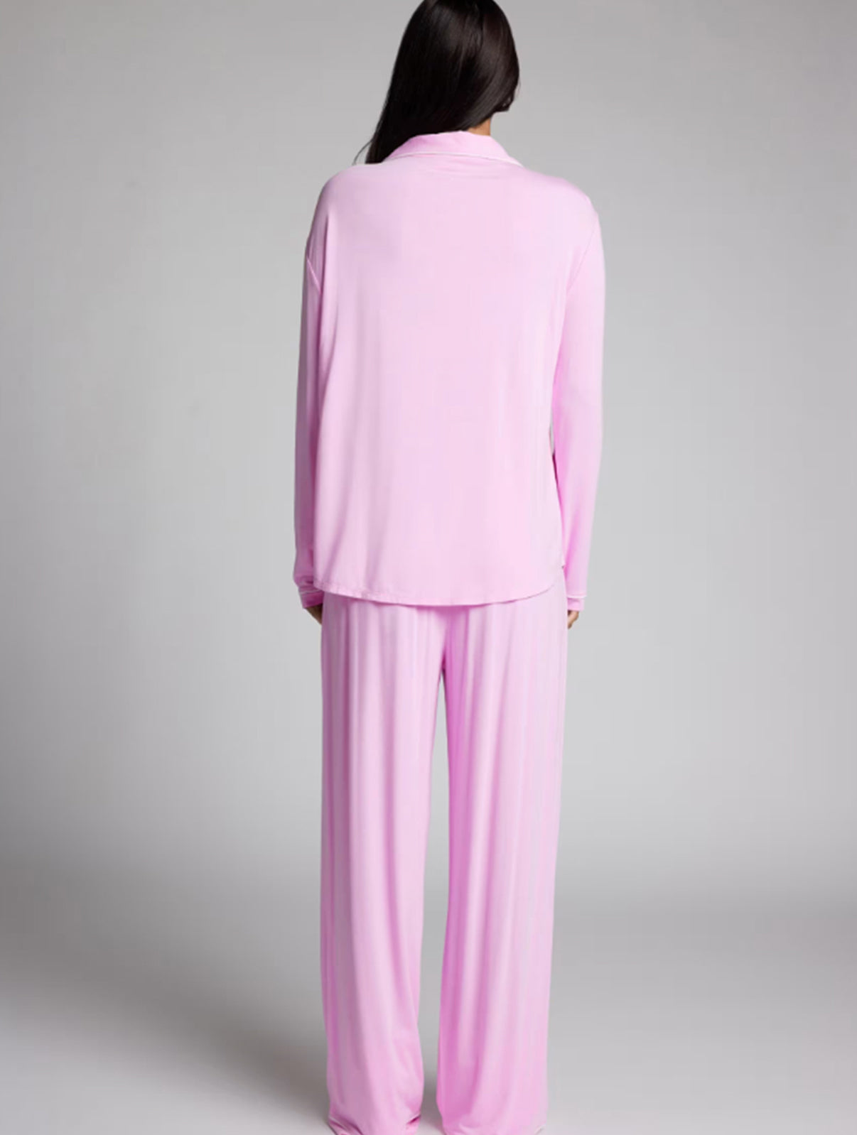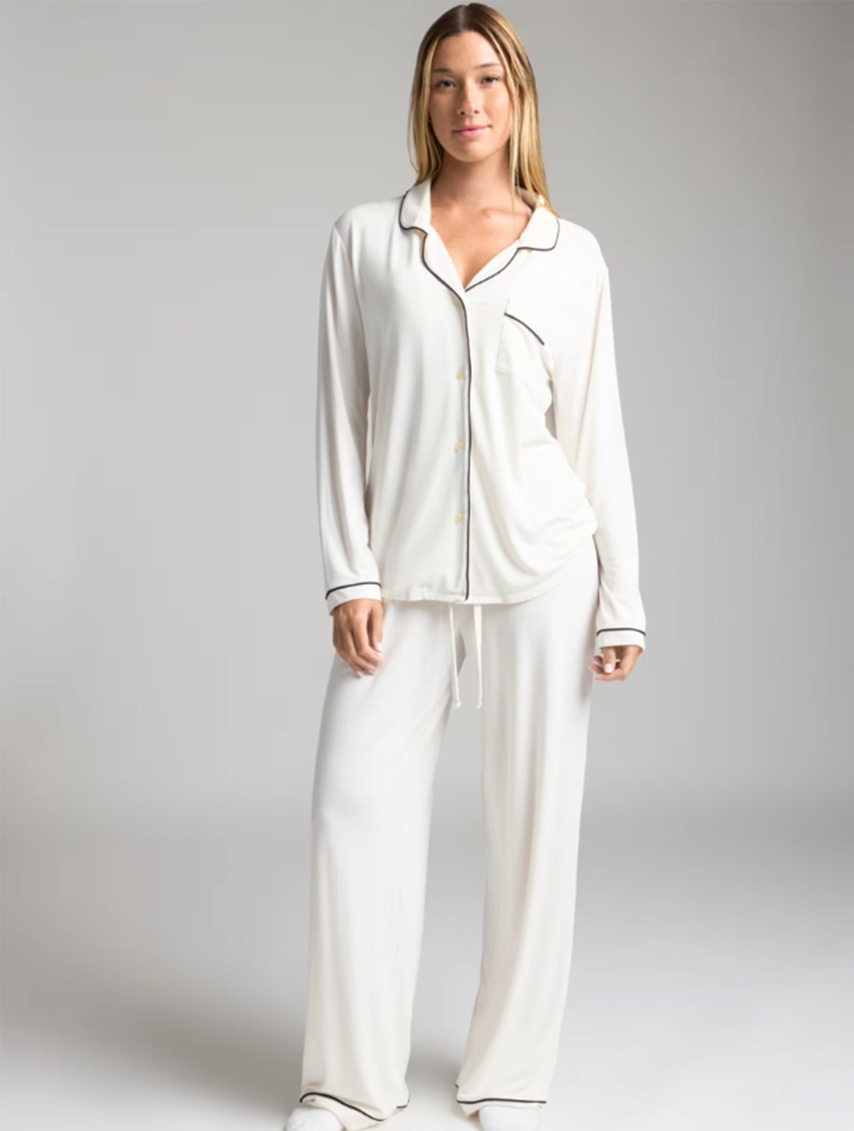 The button-down top features a timeless notch collar and subtle contrast piping for an elevated, chic look. Paired with wide-leg trousers and a gentle drawstring waist, this set offers a relaxed fit that moves with you—perfect for sleeping, lounging or slow mornings at home.