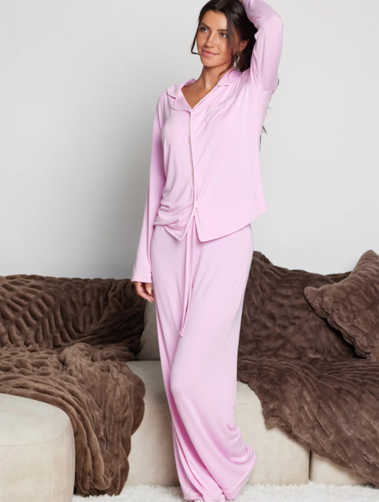 Whether you’re unwinding after a long day or easing into a peaceful morning routine, this pajama set wraps you in softness, calm and elegance.